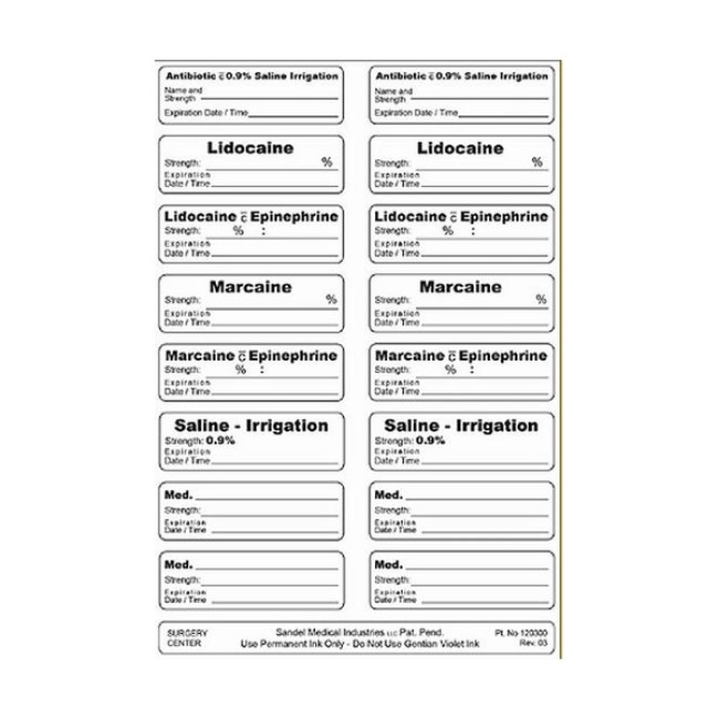 A medication labeling system, including labels, cups and flags, designed to increase safety and compliance on the sterile field. It helps clearly identify all medications and enhances communication among the surgical team.